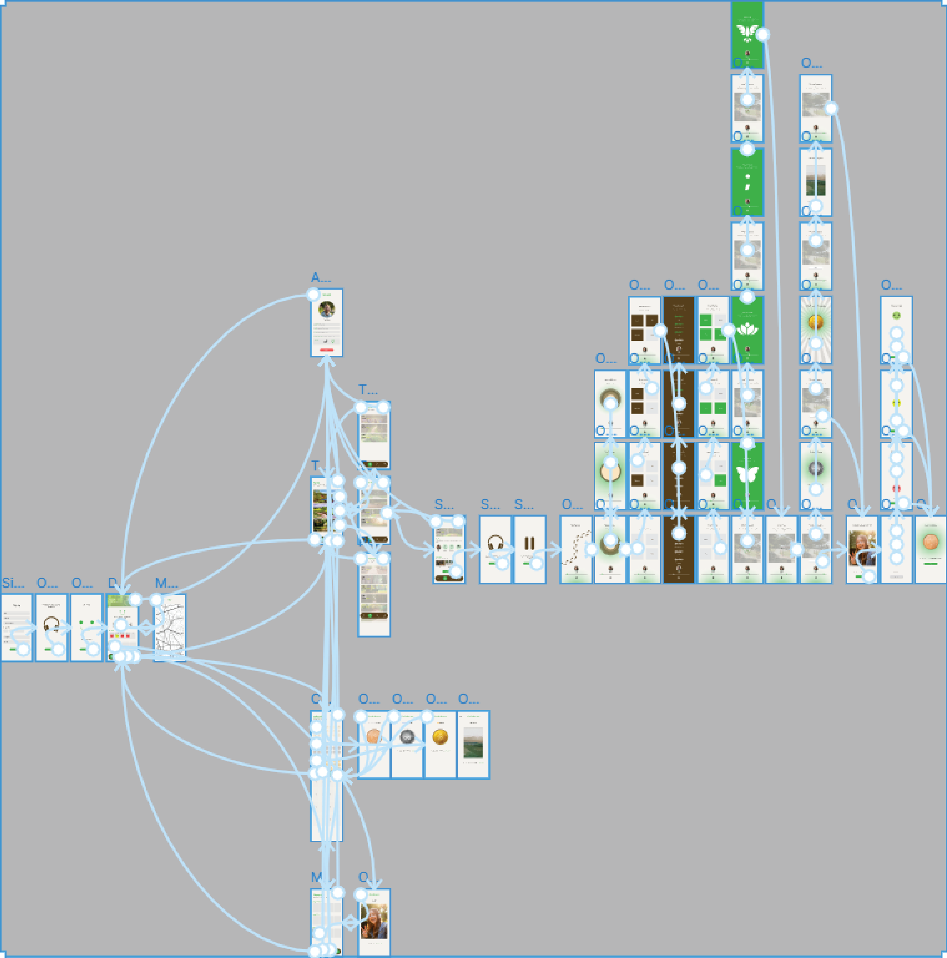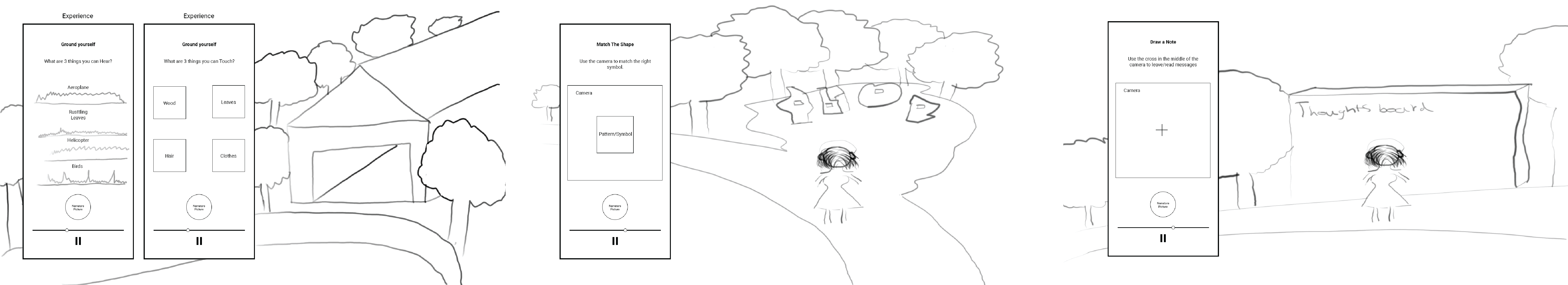 High Fidelity Prototype: After creating the design framework, I was able to use it as a guide to create a high-fidelity prototype. I produced wireframes from the storyboards, then established a component style for the app. The style consisted of earthy colours and art that reflected nature; lots of greens and brown colours for soil and ground. I used a simple minimalist design style that gave a clean and pleasant aesthetic. As the digital experience I wanted to produce was for improving mental health, there needed to be no clutter on the screens. Once both of these assets were created, I could then build a high-fidelity prototype in Figma. The image below shows my prototyping procedure.